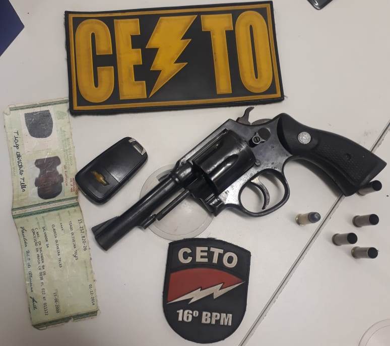 A PM constatou que Prisma possui restrição de furto/roubo e apreendeu um revólver Taurus calibre 38.