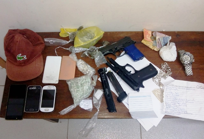 Com o grupo foi encontrado duas pistolas, dois carregadores, um deles alongados, celulares, dinheiro, maconha, cocaína, crack e anotações referentes à venda de drogas.