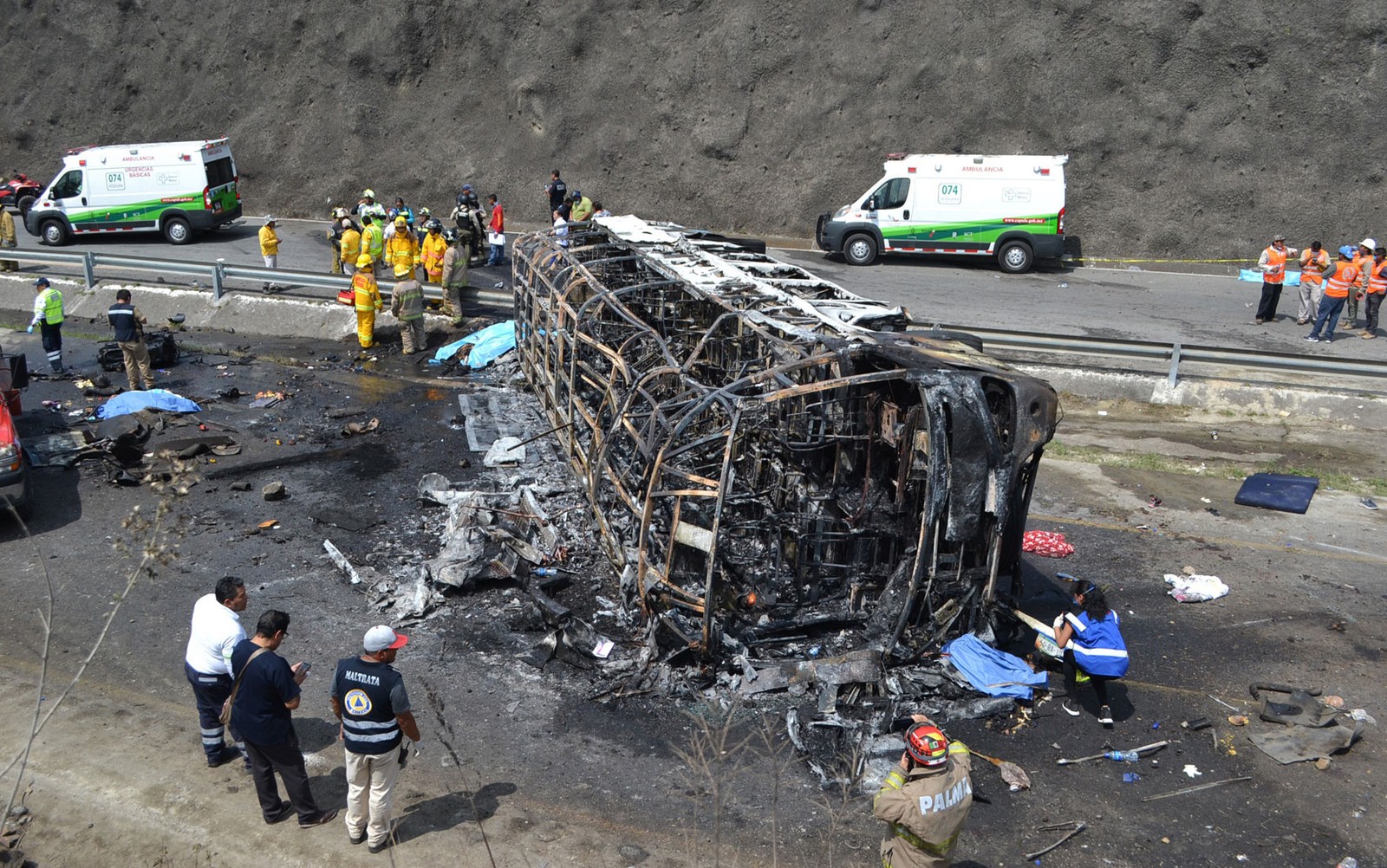 A TV mexicana mostrou o ônibus caído e totalmente calcinado pelas chamas.