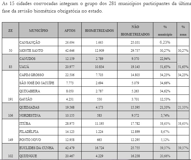 O juiz ouvidor do Tribunal Regional Eleitoral da Bahia (TRE-BA), Rui Barata Filho, presidirá, na próxima quinta-feira (30/5), audiência pública em Euclides da Cunha. O encontro acontecerá na Câmara Municipal, às 14h e servirá para apresentar a nova logística da revisão biométrica extraordinária nos municípios de Cansanção, Canudos, Capim Grosso, Filadélfia, Gavião, Itiúba, Monte Santo, Nordestina, Ponto Novo, Queimadas, Quijingue, Quixabeira, São José do Jacuípe, Uauá.