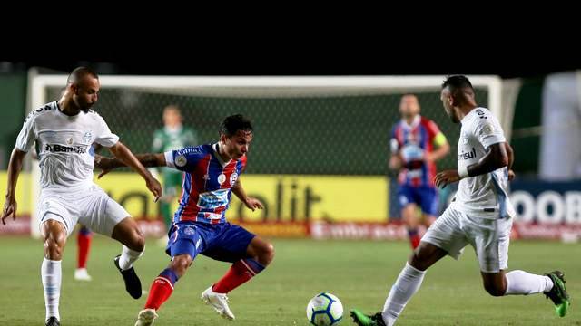 Montados com fortes sistemas de marcação, Bahia e Grêmio criaram poucas chances de gol na primeira etapa. A melhor oportunidade para balançar as redes veio em contragolpe gaúcho. Juninho cruzou rasteiro para a área, a bola passou por Vizeu e sobrou para Pepê chutar forte. Douglas Friedrich fez a defesa à queima-roupa. Pelo lado baiano, Artur e Élber foram muito pressionados e não conseguiram municiar Fernandão.