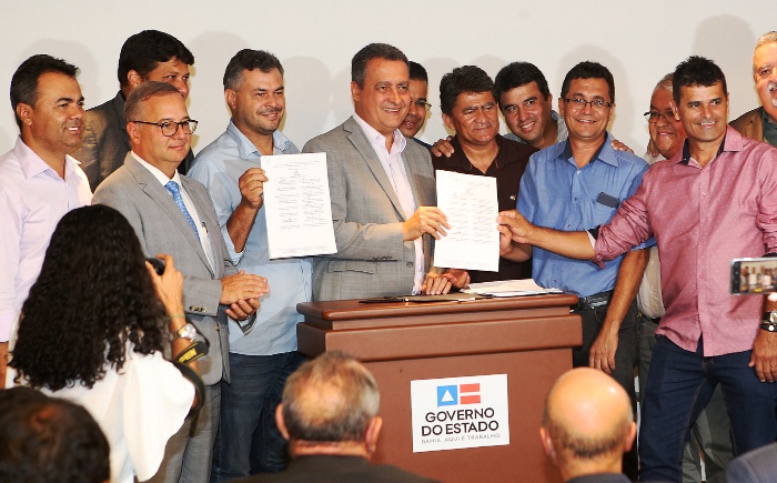 O governador Rui Costa e prefeitos de 41 municípios baianos assinaram, na tarde desta segunda-feira (3), protocolos de intenções para a criação de três consórcios públicos interfederativos de saúde nas regiões de Itaberaba/Seabra, Eunápolis/Porto Seguro e Serrinha. A solenidade foi realizada no Salão de Atos da Governadoria, no Centro Administrativo da Bahia (CAB), em Salvador.