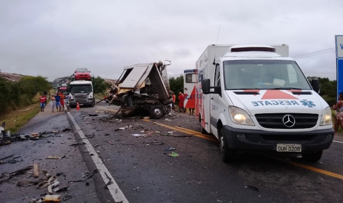 Por volta das 10h deste sábado (6), um grave acidente envolvendo uma carreta e um caminhão, no Km 523, da BR 116, trecho de Itatim, logo após o cruzamento da linha férrea, sentido Morro do Tigre ceifou a vida de um motorista e deixou outras duas pessoas feridas, um delas gravemente.