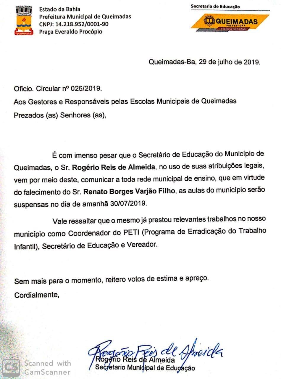 Ele foi também secretario de Educação no Governo de Maurinho, coordenador do PETI (Programa de Erradicação do Trabalho Infantil, e diante desta também prestação de serviço na área de educação, o atual secretário Rogério Reis de Almeida divulgou nota de pesar e o aviso da suspensão das aulas nesta terça-feira.