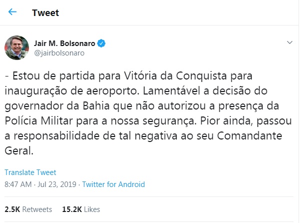 “Estou de partida para Vitória da Conquista para inauguração de aeroporto. Lamentável a decisão do governador da Bahia que não autorizou a presença da Polícia Militar para a nossa segurança. Pior ainda, passou a responsabilidade de tal negativa ao seu Comandante Geral”, escreveu Bolsonaro, em seu Twitter.