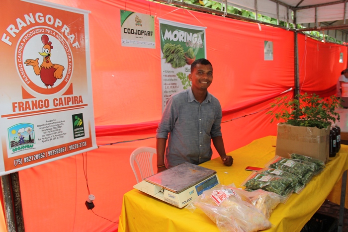 Outra novidade da feira é a comercialização da folha da Moringa, que vem ganhando mercado para alimentar galinhas e frangos caipira, tornando muito mais saudável e baixo custo de investimento.
