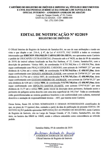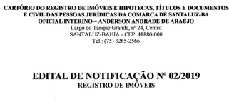 Cartório de Registro de Imóveis de Santaluz – Divulga Edital de Notificação Nº 02/2019