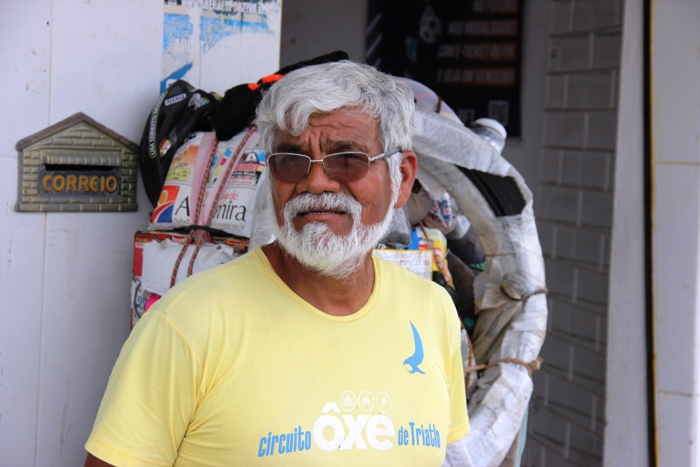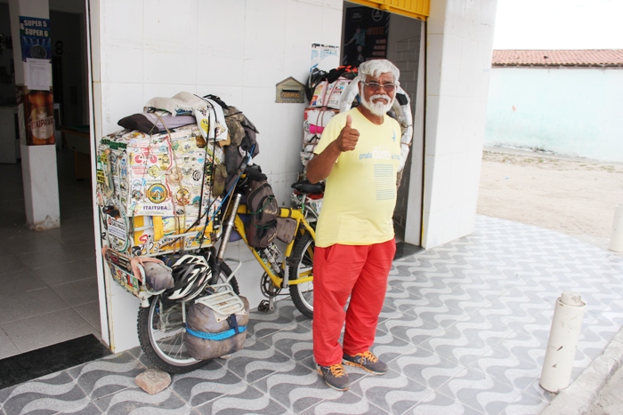 O CN encontrou o mesmo no Povoado Santa Rosa na manhã deste domingo, 1º, sentado na sobra de uma casa e sua bicicleta alguns metros na frente de uma bar. O ciclista aventureiro é o senhor Marcos Guerra, 76 anos, que trás um sotaque de gringo, e segundo ele por ser filho de Italiano, mas garantiu ser amazonense. Antes de contar sua aventura, disse ao Calila Notícias que não estava previsto a parada em Santa Rosa, mas resolveu parar ali para relaxar um pouco depois de ter se chateado com a atitude de um motorista que segundo ele não merece ser chamado assim. A carga da bicicleta pesa aproximadamente 150 quilos.
