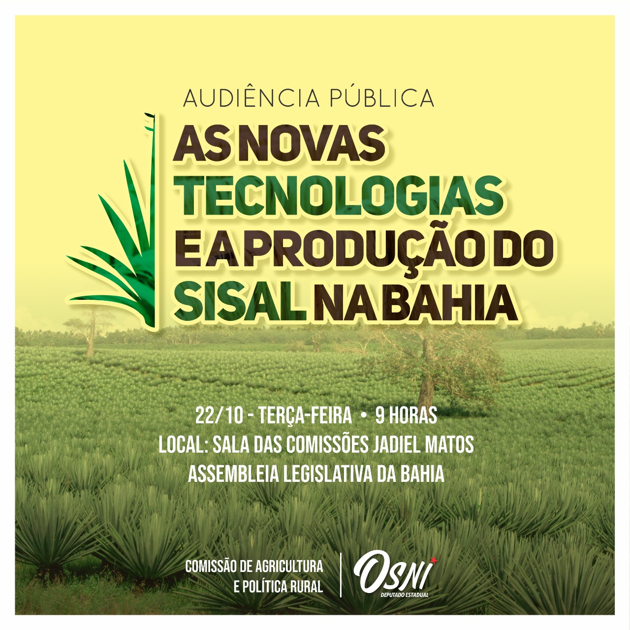 Na próxima terça-feira (22), a partir das 9 horas, na sala das comissões Jadiel Matos, a Assembleia Legislativa da Bahia (ALBA) realiza audiência pública sobre “As novas tecnologias e a produção do sisal na Bahia”. A iniciativa, proposta pelo deputado estadual Osni Cardoso (PT) à Comissão de Agricultura e Política Rural, tem a finalidade de reunir entidades, produtores e representantes governamentais para discutir ações para fortalecer a cadeia produtiva do sisal no estado.