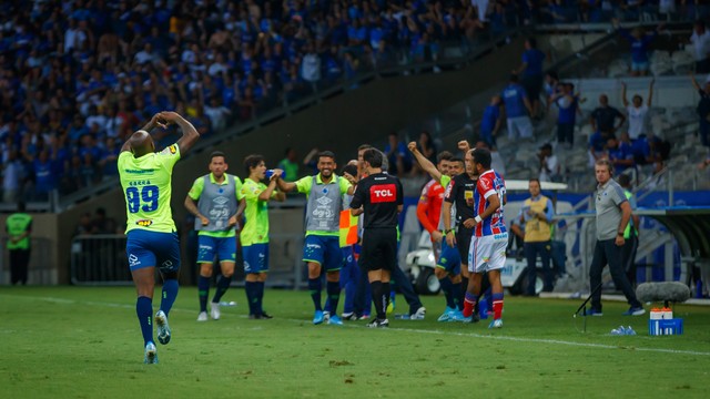O árbitro é chamado pelo VAR, vai revisar o lance no monitor e assinala para a marca do pênalti e ainda expulsa Orejuela que já tinha amarelo. Cruzeiro com um a menos e Fernandão com a chance de colocar o Bahia a frente. Ele cobrou forte e não deu chance a Fábio aos 20 minutos.