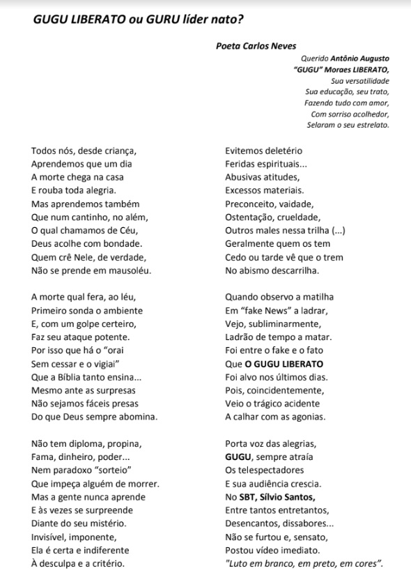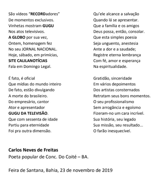 Como todo brasileiro, Carlos Neves lamentou a morte do apresentador e fez uma poesia em sua homenagem: