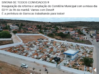 “Estou aqui hoje para convidar todos vocês para participar conosco da inauguração do cemitério Municipal, que vai acontecer no próximo sábado dia 2 novembro, às 9 horas da manhã com a missa, uma linda missa que vai acontecer. É um sonho meu, seu, de toda população de Barrocas, que era a transformação do cemitério, e é isso que nós fizermos, com responsabilidade, com muito respeito, com muito carinho aos nossos entes queridos”, afirmou.