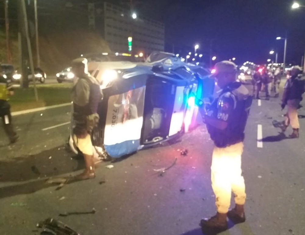 Um homem morreu e sete pessoas ficaram feridas após acidente entre um carro e viatura da Polícia Militar, na madrugada deste sábado (11), na Avenida Paralela, sentido Centro, próximo ao prédio da Receita Federal.