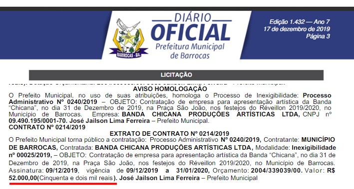 Ainda de acordo com o JANV uma publicação do Diário Oficial do Município de Barrocas, do dia 17 de dezembro de 2019, consta que o show da Banda Chicana custou ao município R$52.000,00 (cinquenta e dois mil reais). Ver abaixo print da página do Diário. O contrato foi assinado no dia 09 de dezembro. Além da Chicana, a Banda Asas Livres e Cardosinho da Bahia se apresentaram no palco montado na Praça São João.