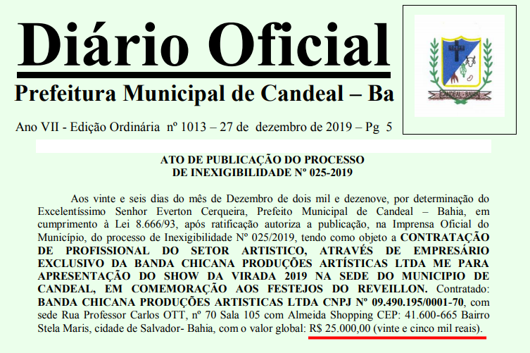 Já a Prefeitura do Município de Candeal, também de acordo com publicação do Diário Oficial do Município contratou a mesma banda por R$25.000,00 (vinte e cinco mil reais). Ver imagem abaixo, e a publicação do Diário Oficial.