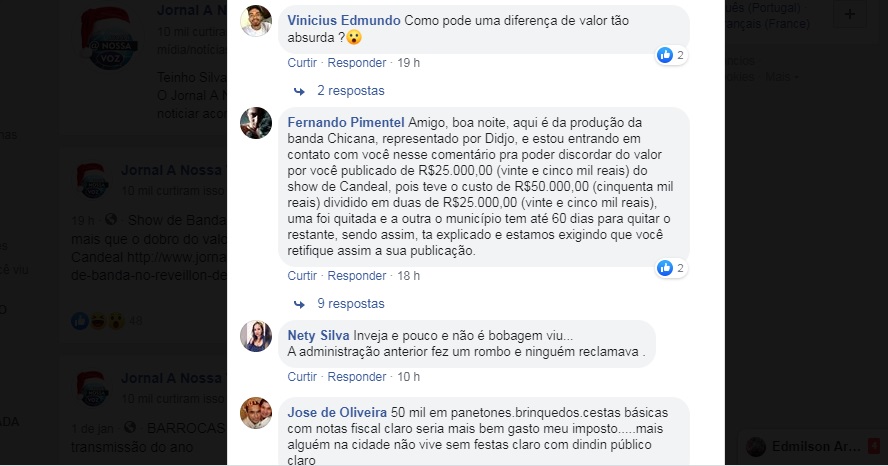 A grande diferença nos valores dos contratos para os shows chamou a atenção de um morador do município de Candeal, em contato com a redação do Nossa Voz, ele escreveu: “Tua cidade fez o mesmo show da virada daqui com mais que o dobro do preço”, informou.