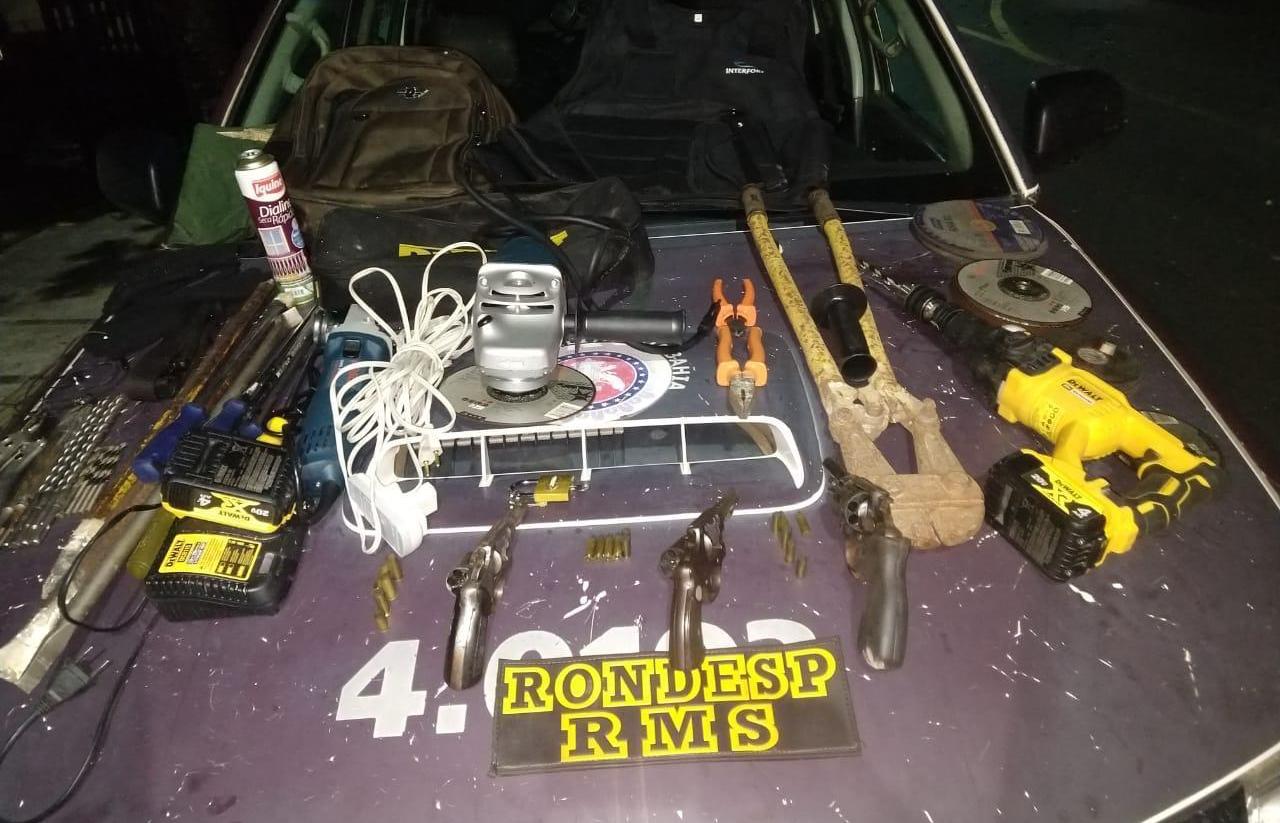 Com eles foram encontrados dois revólveres calibre 32, com 12 munições, um revólver calibre 38, com cinco munições, e os materiais que devem ter sido utilizados no arrombamento do banco. São eles: 29 discos Boch e Wurth utilizados para cortar ferro e paredes, uma máquina martelete, usada para perfurar, três alicates, cinco chaves de fenda, três pés de cabra, uma fita isolante, um cadeado, duas lixadeiras, uma extensão, 11 brocas de furadeira, um alicate de pressão, uma lata tinta spray, cinco mochilas, uma capa de colete antibalístico, um fone, dois pares de luvas, uma bandoleira utilizada para carregar armas e o veículo Fiat Uno branco de placa PCU 6070.