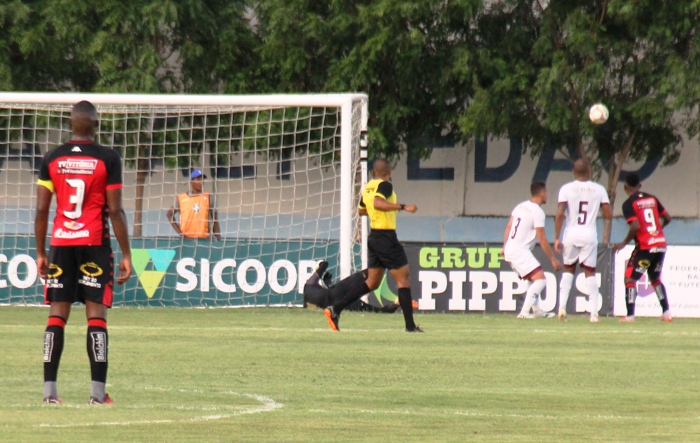 Aos 11 minutos Dedé cometeu pênalti em Thiaguinho. Zagueiro errou o carrinho e atingiu o atacante do Jacuipense, que ficou caído no gramado.