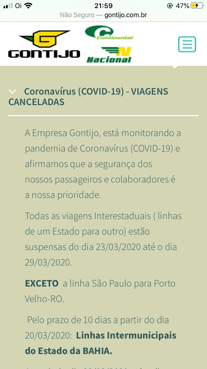 A empresa Gontijo publicou em sua rede social a informação de suspensão de todas as linhas.