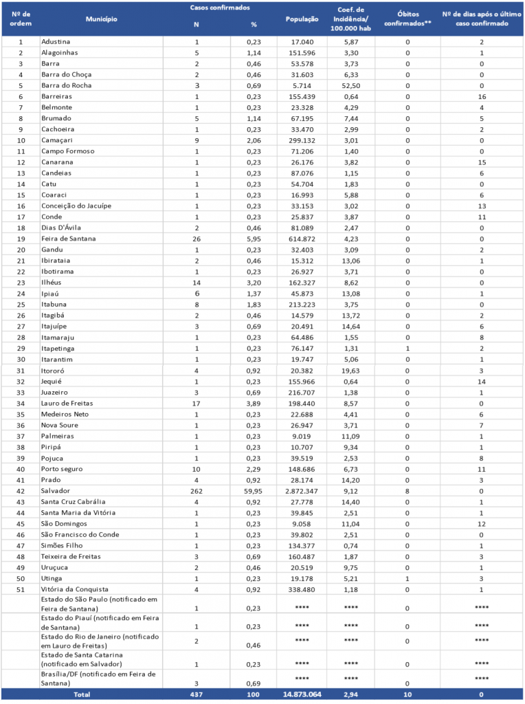 A Bahia registra 437 casos confirmados do novo coronavírus (Covid-19), o que representa 6,7% do total de casos notificados. Até o momento, 2.511 casos foram descartados e houve dez óbitos, sendo 08 no município de Salvador (05 idosos do sexo masculino, 01 idosa do sexo feminino, 01 pessoa do sexo masculino de 55 anos e 01 pessoa de 41 anos do sexo feminino), 01 óbito no município de Utinga (sexo masculino, 80 anos) e 01 no município de Itapetinga (sexo feminino, 28 anos). A letalidade foi de 2,28%.