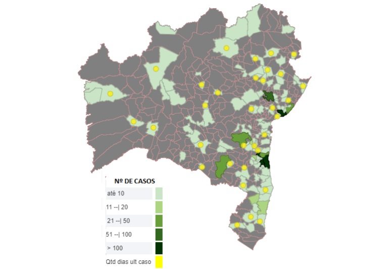 Os casos confirmados ocorreram em 123 municípios do estado, com maior proporção em Salvador (60,36%). Os municípios com os maiores coeficientes de incidência por 1.000.000 habitantes foram Ilhéus (1096,55), Uruçuca (1023,44), Coaraci (765,02,48), Itabuna (694,11) e Gongogi (561,17).