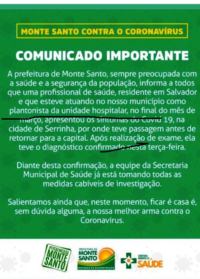 O gestor esclareceu também que o paciente confirmado em Serrinha não tem nenhuma relação com o comunicado feito pela Prefeitura de Monte Santo, sobre uma enfermeira esteve em Serrinha para visitar a família e ao retornar a Salvador apresentou sintomas da doença e teve a confirmação de que estava com a Covid-19. A partir desse momento, a Secretaria de Saúde entrou em contato com a família e está monitorando todas as pessoas que também estiveram em contato com essa profissional.