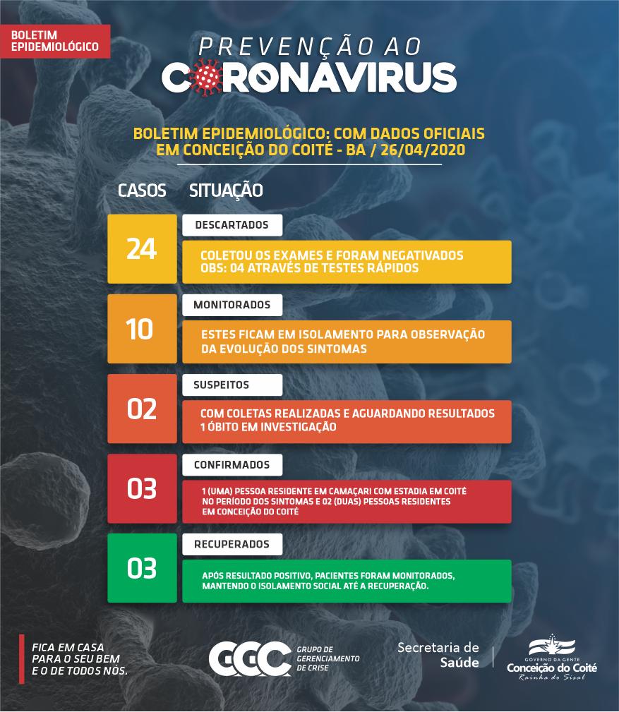 A Prefeitura de Conceição do Coité divulgou neste domingo, 26, um card informativo sobre os números atualizados do Coronavírus no município. A informação praticamente vem sendo a mesma desde o início da semana passada quando revelou que os três pacientes testados com a Covid-19 estavam curados e que tinham outros dois casos suspeitos, e, por último, o alívio de que ambos testaram negativos, coincidiu com o decreto do prefeito Francisco de Assis permitindo a reabertura do comercio na quinta-feira, mesmo tendo que cumprir uma série de determinações.