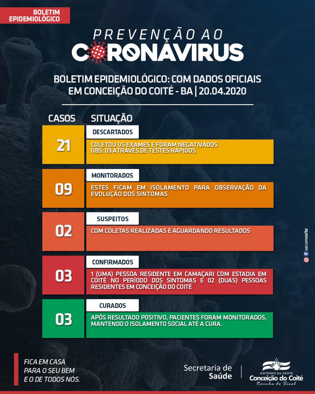 Assim sendo, de acordo com um card divulgado pela Prefeitura de Coité, os três casos confirmados da Covid-19 no município estão curados. Ao todo são 21 casos que testaram negativos, tem 9 pessoas sendo monitoradas, e dois casos suspeitos aguardando resultado do Lacen, porém o Calila Notícias constatou que na relação da SESAB divulgada depois do card aparece Coité com 3 casos, ou seja, novidade na relação.