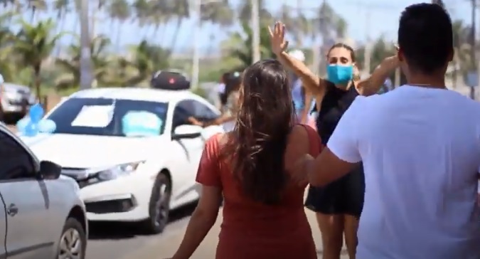 Ao perceber a presença de vários carros estacionados em frente ao prédio onde mora no 11º andar ela e o esposo Lucas desceram para recepcionar os amigos que cumpriram o que determina a Organização Mundial de Saúde (OMS) ou seja, com o abraço simbólico e o pacote de fralda depositado.