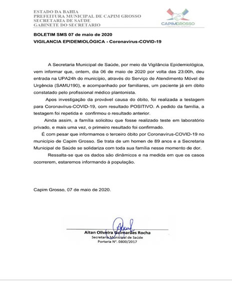 A Prefeitura Municipal de Capim Grosso no Território da Bacia do Jacuípe, através da Secretaria de Saúde através de uma nota anunciou o terceiro óbito de pessoas residentes no município, vitimas da Covid-19, o que deixa todos em alerta, considerar que desde o início da pandemia foram registrados 21 casos suspeitos, sendo 15 descartados e seis confirmados, destes, metade evoluiu para óbito e um paciente recuperado. Segundo o boletim, no momento não tem nenhum caso suspeito.