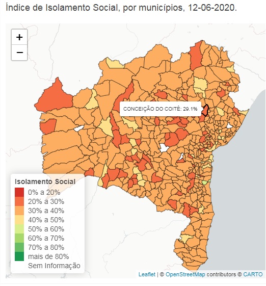 O índice de isolamento social que é divulgado diariamente pela plataforma In Loco no Site da Superintendência de Estudos Econômicos e Sociais do Estado da Bahia – SEI que na sexta-feira, 12, mostrou Conceição do Coité com uma taxa de isolamento social de 43.2%, relativo a quinta-feira, 11, feriado do Corpus Crhisti, 8.5% a mais que a taxa de quarta-feira, 10, quando teve 35.2%, neste sábado, 13, voltou a cair drasticamente e certamente após o movimento da feira livre. O índice mostrado neste sábado está na segunda pior faixa de isolamento com 29.1%, uma queda de 14.1% em relação a ontem.
