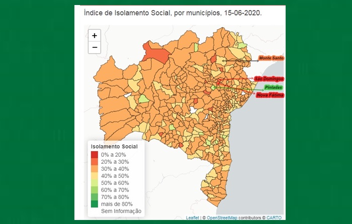 Algumas cidades que promoveram o Lockdown não tiveram o resultado esperado na taxa de isolamento social, mas o confinamento total em Pintadas na Bacia do Jacuípe e Monte Santo no Território do Sisal se não melhorar, pior não fica, pelo menos é o que mostra o mapa da Bahia da Plataforma InLoco que mede diariamente a movimentação de todas cidades baianas e os resultados dos índices de isolamento publicados no Site da Superintendência de Estudos Econômicos e Sociais do Estado da Bahia.