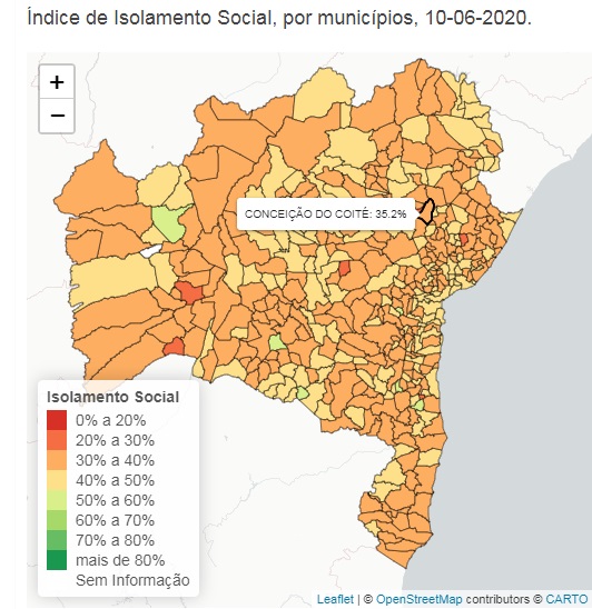Diante da grande presença de pessoas nas ruas de Coité a cidade alcançou nos últimos dias, no máximo, metade da taxa ideal de isolamento social que é monitorado diariamente pela Plataforma InLoco e publicado no site da Superintendência de Estudos Econômicos da Bahia – SEI. O Calila Notícias acompanha diariamente o mapa com as taxas de isolamento e Coité jamais passou de 35% quando o ideal é 70%, por sinal nenhum município alcançou 60%.