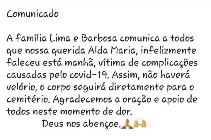 Ainda de acordo com o Noticias do Sisal, a família postou um comunicado a respeito do falecimento de dona Alda nas redes sociais e agradeceu a todos pelas orações e pelo apoio nesse momento de dor.