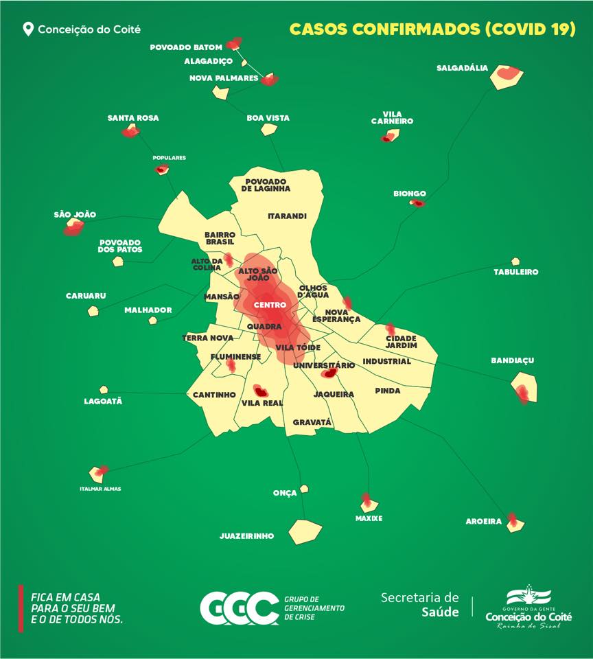 O mapa foi ajustado com os locais com casos confirmados. O bairro da Pinda não tem casos, como divulgado no mapa anterior.