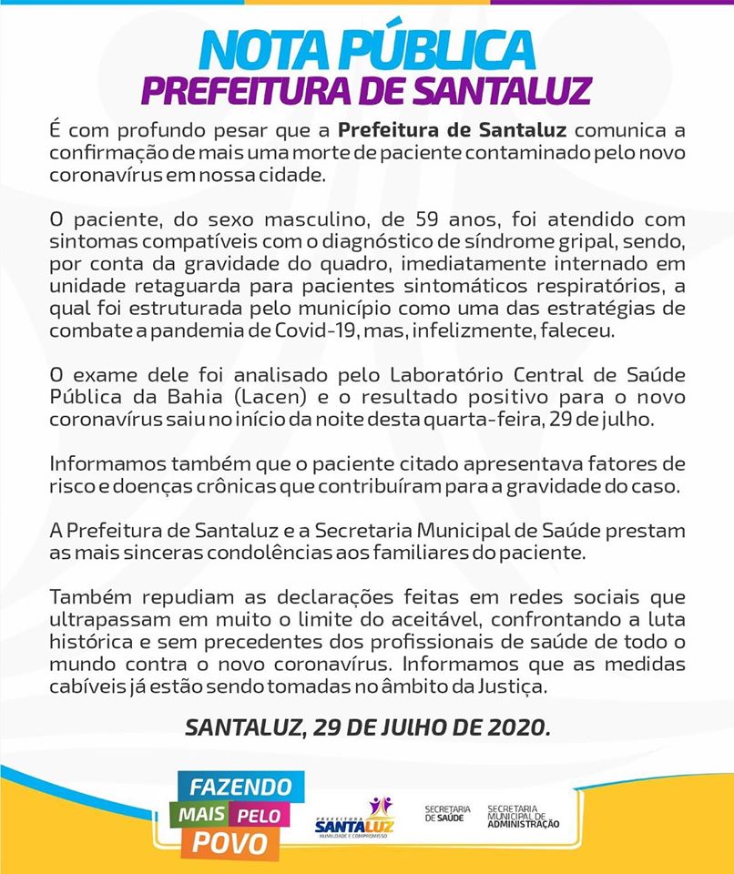 A Prefeitura de Santaluz divulgou na noite desta quarta-feira, 29, o boletim epidemiológico que traz a confirmação de mais um óbito. Um homem de 59 anos que faleceu na última segunda-feira, 27, no mesmo dia que seu pai de 81 anos, teve a confirmação através do Laboratório Central de Saúde Pública da Bahia (Lacen).