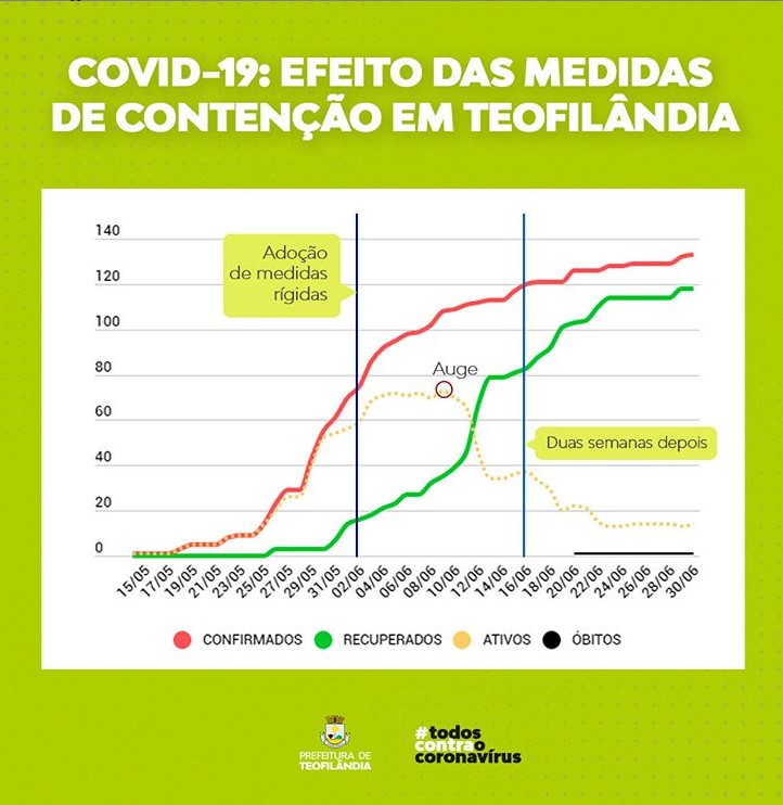 Após 4 semanas da adoção de medidas rígidas de isolamento social, número de ativos caiu 78% em Teofilândia. No domingo (05), o município tinha 134 casos confirmados, sendo apenas 09 ativos, 134 recuperados e 01 óbito.