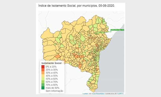A Bahia registrou nesta segunda-feira, 06, melhoria no índice de isolamento social, isto graças a melhoria da taxa em todos os municípios do estado que alcançou 49.36%, ficando em 12º lugar. Rio Grande do Sul que ficou em primeiro lugar marcou 57.84%. Vale lembrar que o índice divulgado hoje é relativo a circulação de pessoas no domingo, 05.