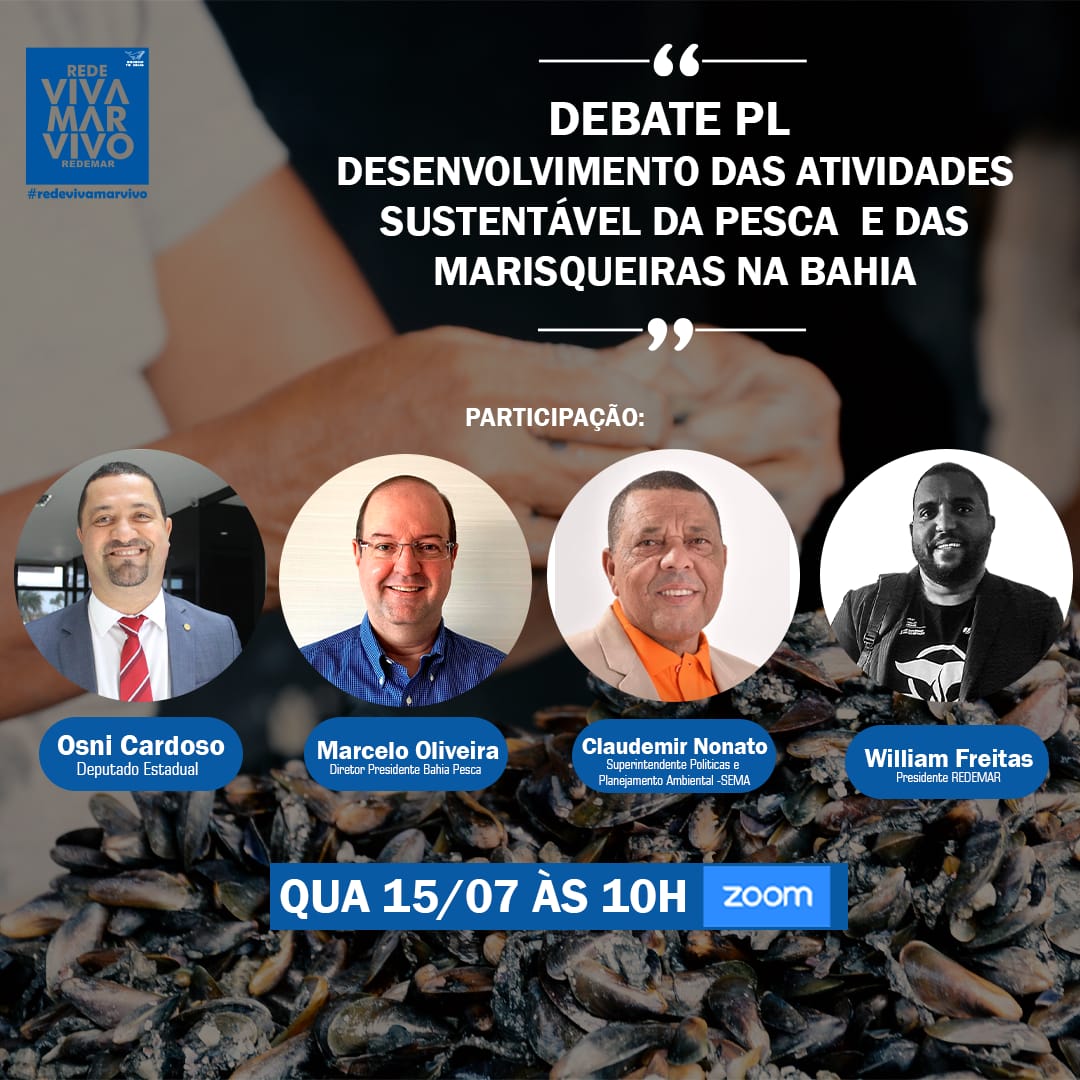 A discussão acontece por meio da plataforma zoom, com participação confirmada de Osni, do diretor-presidente da Bahia Pesca/Seagri, Marcelo Oliveira, do superintendente de Políticas e Planejamento Ambiental da Secretaria do Meio Ambiente do Estado da Bahia (Sema), Claudemir Nonato, e do presidente do Redemar, William Freitas.