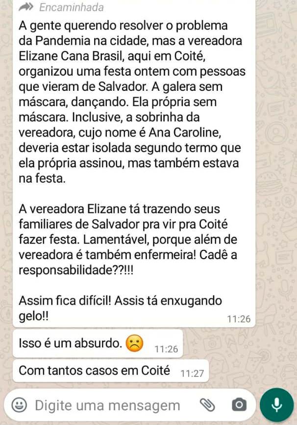 Está repercutindo em Conceição do Coité em mídias sociais, um vídeo onde aparece a vereadora de Conceição do Coité, Elizane Cana Brasil eleita em 2016 pelo PSDB para seu quarto mandato, é filmada em um ambiente que supõe-se que seja um bar. Todos que aparecem no vídeo, incluindo a parlamentar estão sem máscara.