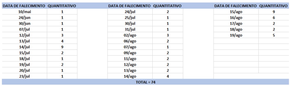 O boletim epidemiológico de hoje contabiliza 74 óbitos que ocorreram em diversas datas, conforme tabela abaixo. A existência de registros tardios e/ou acúmulo de casos deve-se a sobrecarga das equipes de investigação, pois há doenças de notificação compulsória para além da Covid-19. Outro motivo é o aprofundamento das investigações epidemiológicas por parte das vigilâncias municipais e estadual a fim de evitar distorções ou equívocos, como desconsiderar a causa do óbito um traumatismo craniano ou um câncer em estágio terminal, ainda que a pessoa esteja infectada pelo coronavírus.