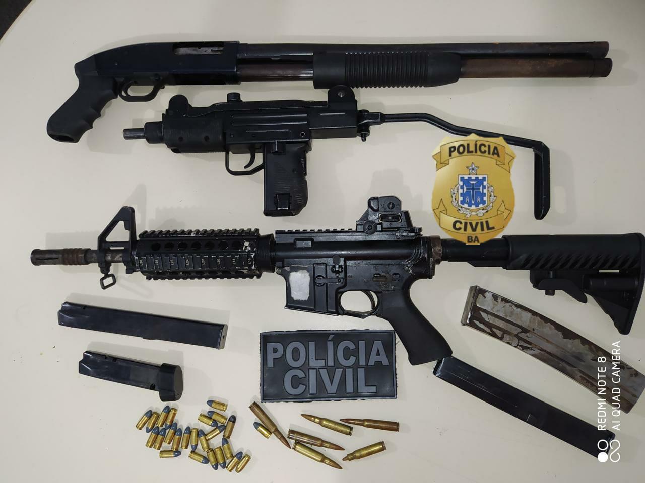 O trabalho de inteligência da Delegacia de Repressão a Furtos e Roubos (DRFR) de Feira de Santana resultou, na segunda-feira (24), nas apreensões de fuzil, metralhadora, espingarda e cerca de 100 kg de entorpecentes. Os materiais estavam dentro de uma casa, em um condomínio de classe média alta.