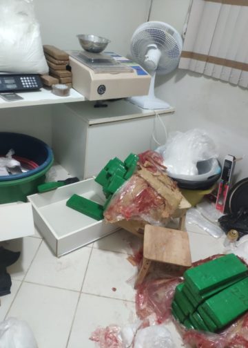 No imóvel as equipes encontraram um fuzil calibre 556, uma submetralhadora calibre 9mm, uma espingarda calibre 12, carregadores, munições, quatro coletes balísticos, 47 kg de maconha, 45 kg de cocaína, uma prensa hidráulica, uma máquina para embalar a vácuo e uma grande quantidade de sacos plásticos.