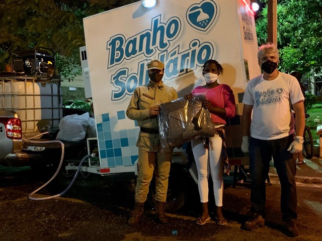 A ação da Patrulha Solidária colocou um banheiro itinerário com direito a pia e chuveiro quente. A estrutura foi cedida pelo empresário e amigo dos PMs, Claudio Lacerda, que também se fez presente.