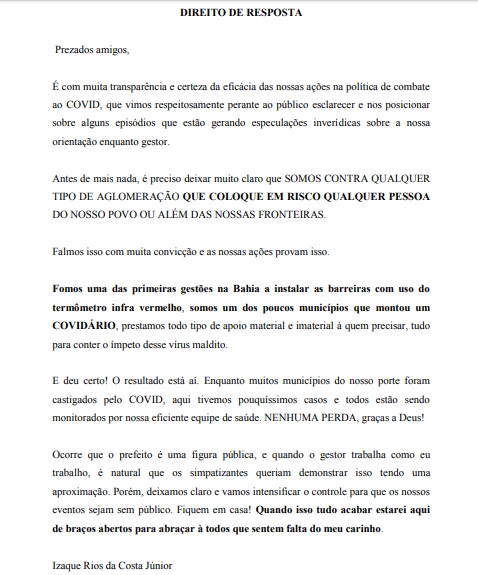O Calila Notícias recebeu nesta sexta-feira, 14, o pedido de direito de resposta pela assessoria jurídica do prefeito Izaque Junior em razão da publicação de uma reportagem que teve como título: Fim da Pandemia? Evento promovido pela Prefeitura de São Domingos é marcado por carreata e aglomeração de pessoas.