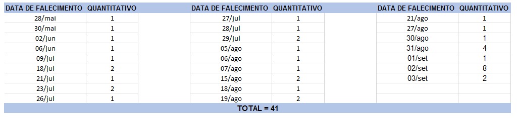 O boletim epidemiológico de hoje contabiliza 41 óbitos que ocorreram em diversas datas, conforme tabela abaixo. A existência de registros tardios e/ou acúmulo de casos deve-se a sobrecarga das equipes de investigação, pois há doenças de notificação compulsória para além da Covid-19. Outro motivo é o aprofundamento das investigações epidemiológicas por parte das vigilâncias municipais e estadual a fim de evitar distorções ou equívocos, como desconsiderar a causa do óbito um traumatismo craniano ou um câncer em estágio terminal, ainda que a pessoa esteja infectada pelo coronavírus.