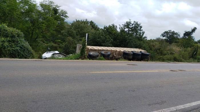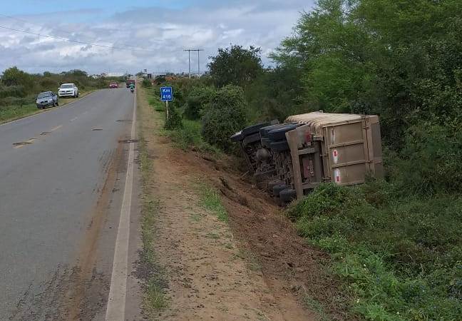 Uma carreta caçamba carregada de pedras tombou depois de sair da pista quando trafegava pela Rodovia BA 120, trecho Coité – Riachão do Jacuípe. O acidente, segundo apurou o repórter Genivaldo Santos aconteceu no início da madrugada desta sexta-feira, 04, na altura do Açude do Cedro, aproximadamente 1,5 km da sede do município de Riachão.