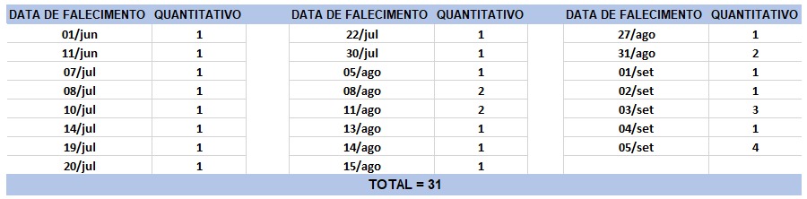 O boletim epidemiológico de hoje contabiliza 31 óbitos que ocorreram em diversas datas, conforme tabela abaixo. A existência de registros tardios e/ou acúmulo de casos deve-se a sobrecarga das equipes de investigação, pois há doenças de notificação compulsória para além da Covid-19. Outro motivo é o aprofundamento das investigações epidemiológicas por parte das vigilâncias municipais e estadual a fim de evitar distorções ou equívocos, como desconsiderar a causa do óbito um traumatismo craniano ou um câncer em estágio terminal, ainda que a pessoa esteja infectada pelo coronavírus.