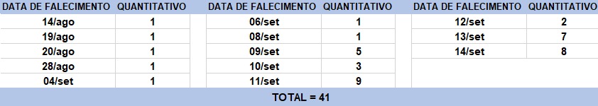 O boletim epidemiológico de hoje contabiliza 41 óbitos que ocorreram em diversas datas, conforme tabela abaixo. A existência de registros tardios e/ou acúmulo de casos deve-se a sobrecarga das equipes de investigação, pois há doenças de notificação compulsória para além da Covid-19. Outro motivo é o aprofundamento das investigações epidemiológicas por parte das vigilâncias municipais e estadual a fim de evitar distorções ou equívocos, como desconsiderar a causa do óbito um traumatismo craniano ou um câncer em estágio terminal, ainda que a pessoa esteja infectada pelo coronavírus.