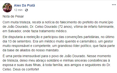 Deputado Alex da Piatã divulgou nota de pesar